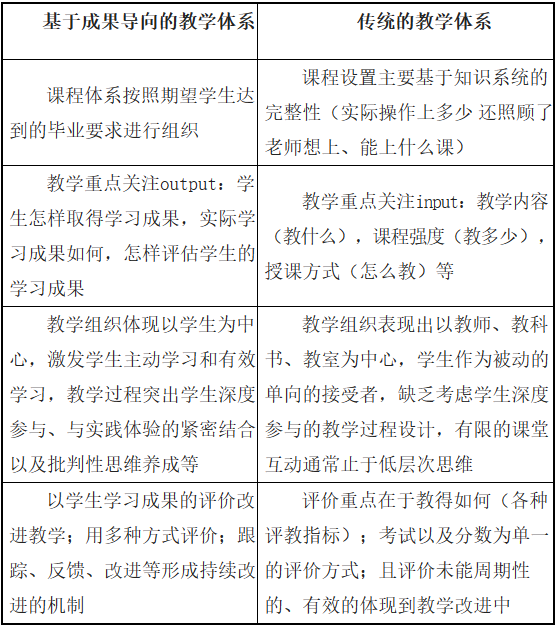 基于成果导向(OBE)的教学与传统教学体系的差异如表 1 所示。