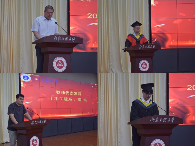 教师代表土木工程系教师陶韬在发言中深情寄语毕业生,鼓励毕业生要守护骨子里的真诚与笨拙;珍惜患难与共的缘分;做一个有温度的技术派;在风雨中构筑理想的模样。毕业生代表土木212班吴博同学发言,回忆了大学的美好时光,表达了对母校的爱,师长的爱,决心在以后的道路上无愧于老师的辛勤培养,无愧于母校的期盼。毕业生代表工程211班王金雨、工程211班张炜华、土木212张硕宇、土木222江峰黄环、给排水241董晶晶、土木241万嗣凯团同学分别为毕业生献唱歌曲《祝福》《凤凰花开的路口》,朗诵《毕业,不说再见》表达对学校的培育之情,辅导员张靖献唱《鞋子特大号》为毕业生送去美好祝福。