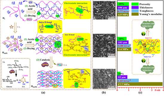 酶响应水凝胶的设计在细胞治疗、生物医学研究和组织工程领域具有广泛的应用前景。它们的合理设计通常取决于酶响应机制。为揭示天然基水凝胶酶响应机制,团队成功构建了可调控的壳聚糖/单宁酸/g-聚谷氨酸水凝胶平台,通过追踪单宁酸水解产生的没食子酸在水凝胶中的动态分布,及其在水凝胶结构性能演变过程中作用,系统揭示了水凝胶酶响应机制。这为理性设计酶响应水凝胶提供了理论指导,有助于水凝胶的智能化,有力推动了天然基水凝胶的应用开发。