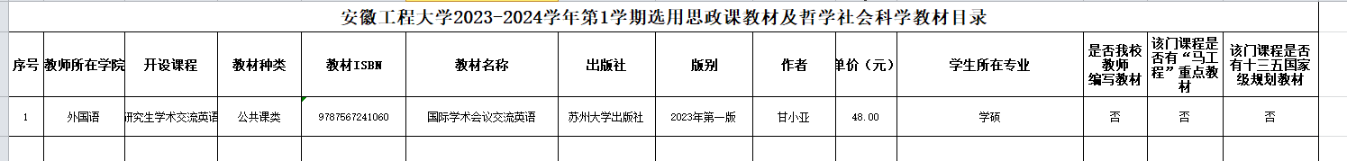 根据学校《新利官网app教材管理办法》要求,经课程组提出选用申请,学院审核,马克思主义理论和思想政治教育方面的专家审查,学院党委会审议、党政联席会议审定,现将2023-2024学年第1学期学硕教材选用情况公示如下: