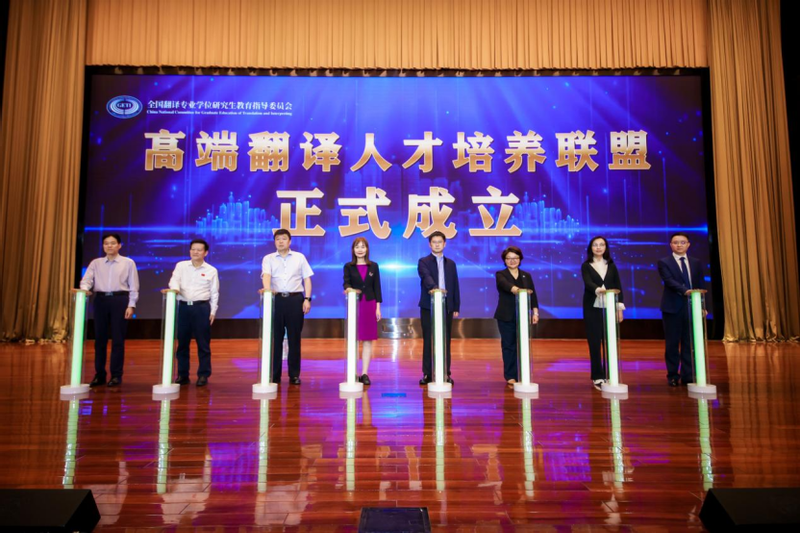 会议期间举行了高端翻译人才培养联盟成立仪式。来自北京外国语大学、中国政法大学、黑龙江大学、上海外国语大学、湖南师范大学、四川外国语大学、西安外国语大学和广东外语外贸大学共八所首批开设翻译博士专业学位的院校领导和代表参加成立仪式。培养联盟将整合院校优势特色,推动资源共享与联合培养,通过建立协同机制总结推广培养经验成果,促进学界业界深度融合,提升翻译实践能力,引领全国翻译专业教育高质量发展,服务国家战略需求。